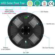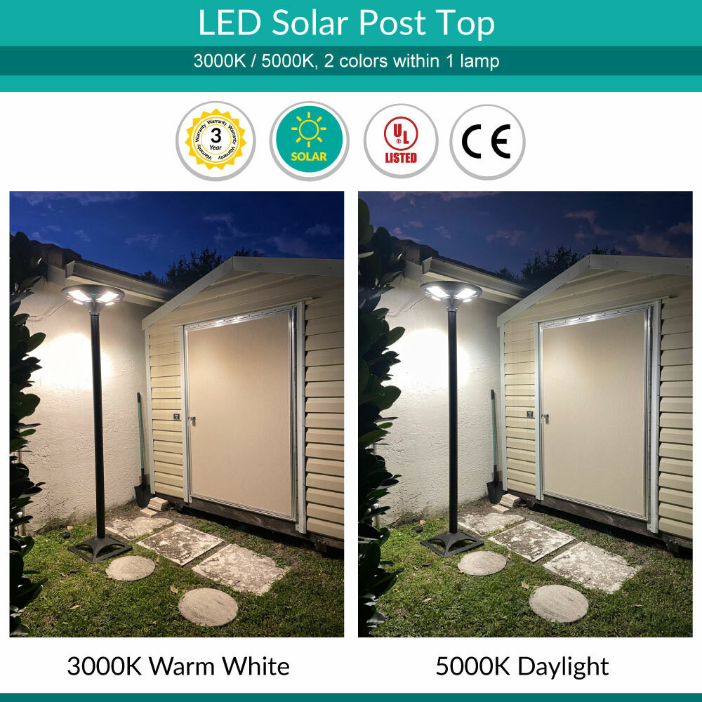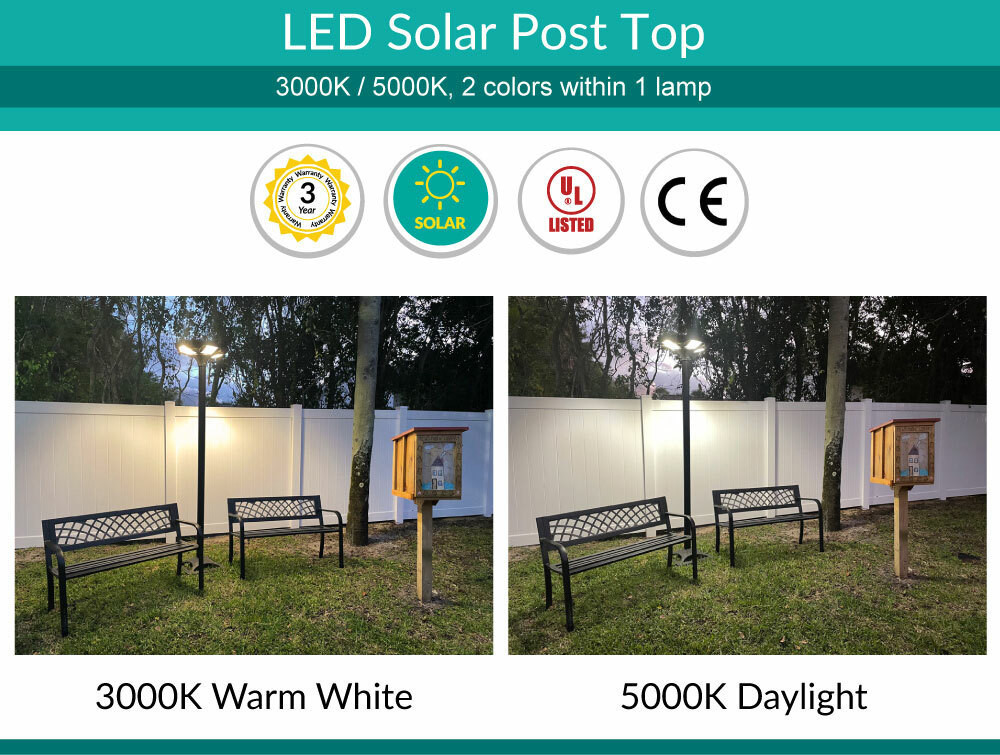 Solar LED Post Top Light w/ Timed Dimming - Dusk To Dawn - 3 Phase Dimming to Preserve Battery - Extremely Bright - Commercial Grade - 40 Watt - 4000 Lumen Output - Warm White/Daylight Color Switchable