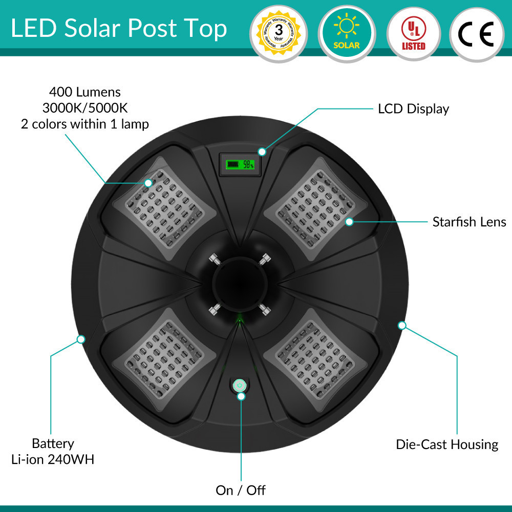 Solar LED Post Top Light w/ Timed Dimming - Dusk To Dawn - 3 Phase Dimming to Preserve Battery - Extremely Bright - Commercial Grade - 40 Watt - 4000 Lumen Output - Warm White/Daylight Color Switchable